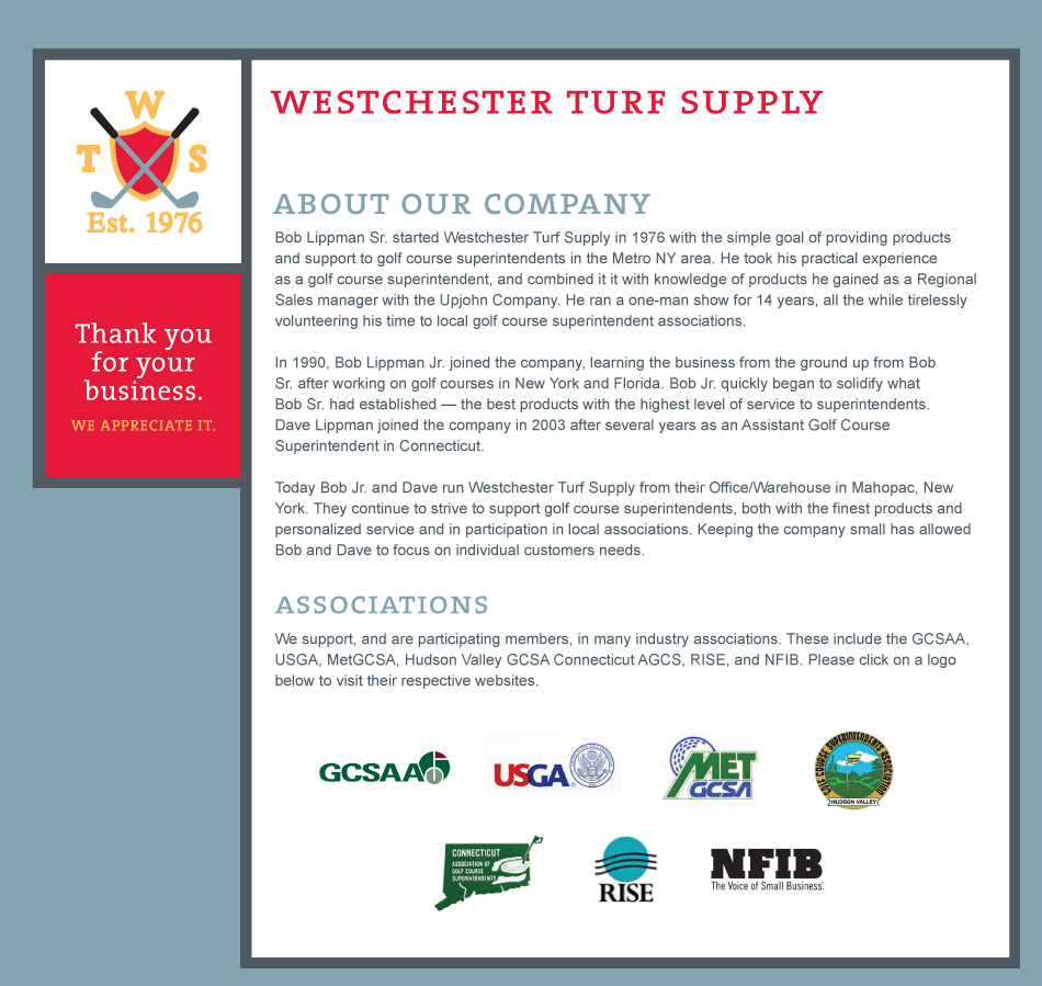 © 2011 WESTCHESTER TURF SUPPLY. ALL RIGHTS RESERVED. WEBSITE BY PLAYBOOKS FOR GOLF.